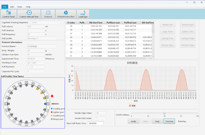 此界面展示吸烟过程中关键状态的实时监控,包括抽吸次数、每口开始与结束时间、烟气曲线、转盘运行状态及点烟/送烟等动作反馈。可视化的吸烟曲线让用户实时查看系统运行状态,自动记录关键数据,并可与动物暴露、细胞暴露设备联动,提升实验效率与安全性。