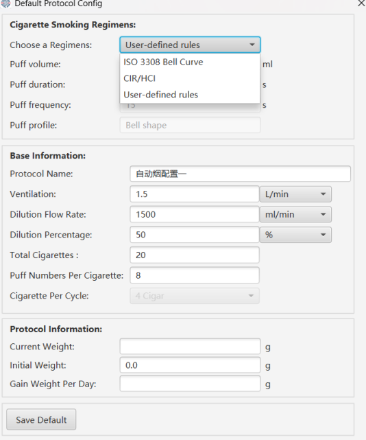 arSoftp 提供多种吸烟规则选项,包括 ISO 3308 钟形曲线、CIR/HCI 以及自定义吸烟规则。用户可在此界面对每个参数进行统一设置,作为默认实验模板使用,提高不同实验之间的一致性和可复现性。所有参数均可独立调整,确保系统运行更灵活可控。