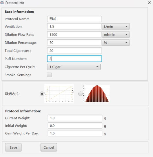 arSoftp 软件支持完整的吸烟协议配置,包括通风量、稀释流量、稀释比例、总香烟数、单支吸烟口数等关键参数的自定义设置。用户可根据实验方案快速创建、保存和调用协议。界面同时支持吸烟曲线选择,使吸烟方式直观呈现,满足多类暴露实验需求。