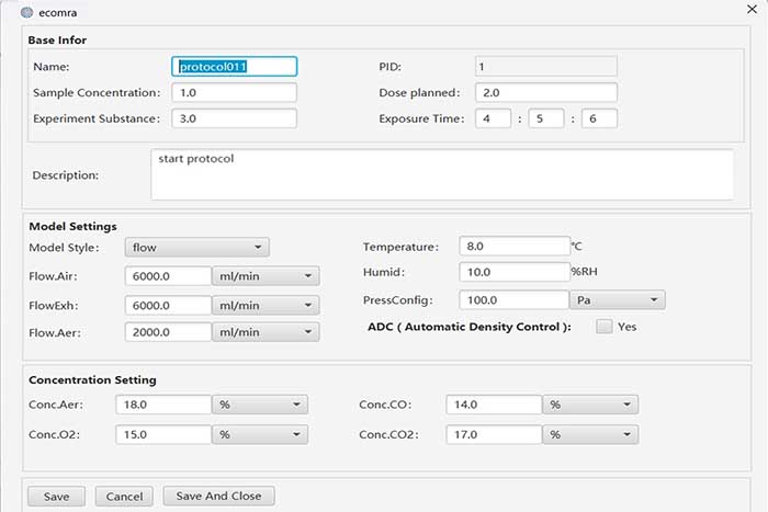 可对吸入暴露实验的控制程序进行编写,存储,调用,实验数据可以提供多种格式输出。在Protocol设置界面中可设置或修改的参数有:压力,浓度,流量,实验时间,工作模式等等,通过创建唯一标识ID号进行存储,查询或修改。