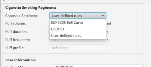 arSoftp 提供多种吸烟规则选项,包括 ISO 3308 钟形曲线、CIR/HCI 以及自定义吸烟规则。用户可在此界面对每个参数进行统一设置,作为默认实验模板使用,提高不同实验之间的一致性和可复现性。所有参数均可独立调整,确保系统运行更灵活可控。